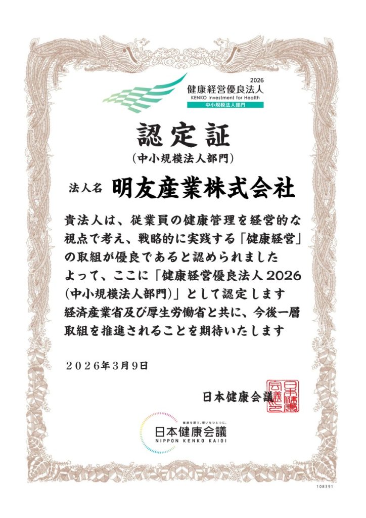 明友産業株式会社は2026年3月9日に社員の健康管理を経営的な視点で考え、戦略的に実践する「健康経営」に積極的に取り組む優良企業を選定する「健康経営優良法人2026(中小規模法人部門)」に選定されました。